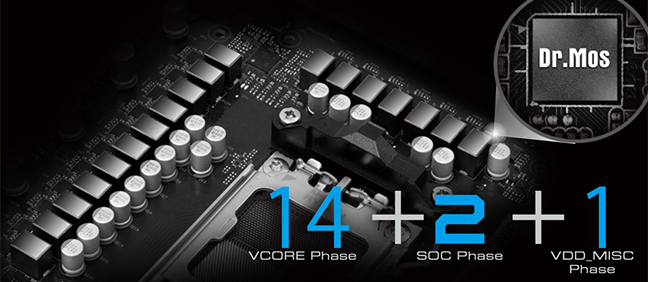 • 14+2+1 Phase Power Design, 80A Dr.MOS for VCore+SOC+MISC