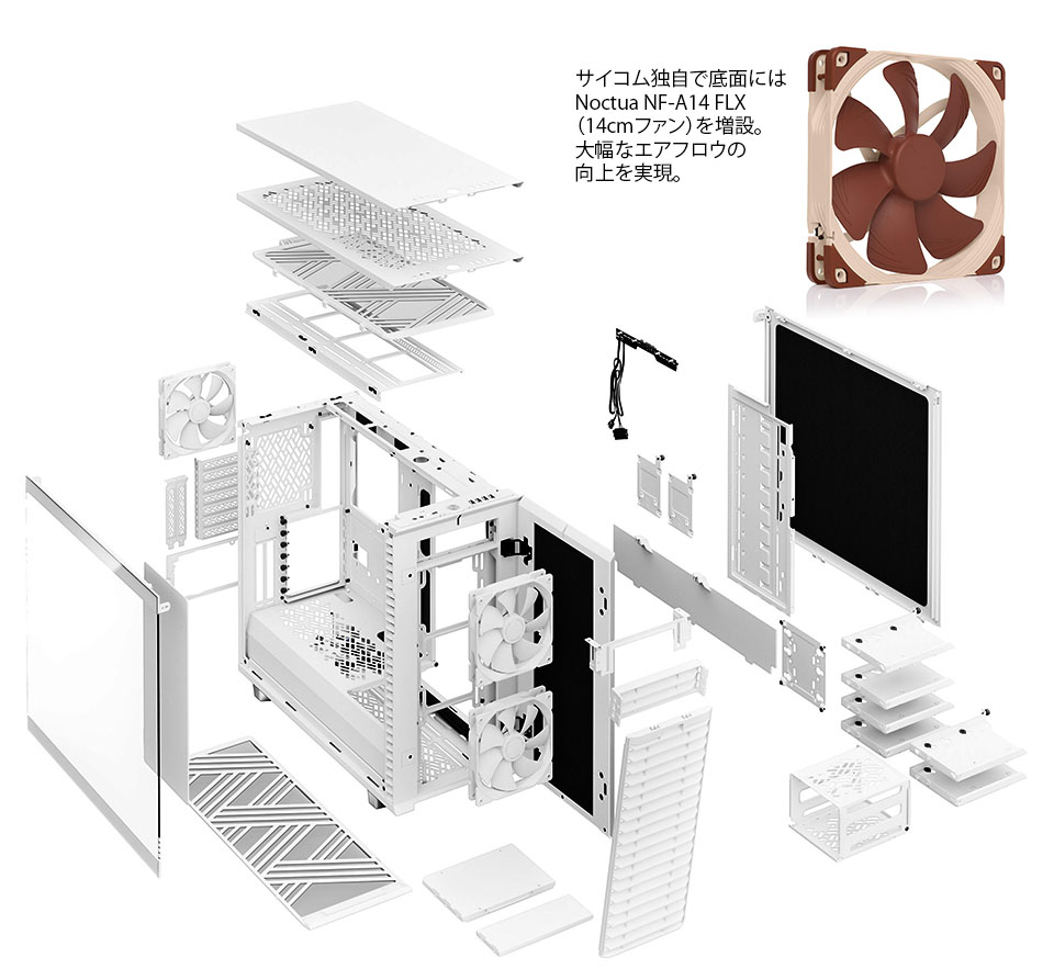 更なるエアフロウ向上の為、サイコム独自で底面にNoctua製14センチファンも増設済み