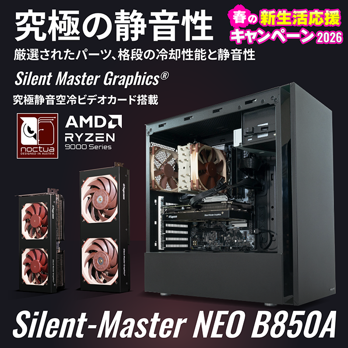 - こだわりのNoctua製空冷CPUクーラーを採用し、エアーフローと静音性のバランスを極めた静音PC。AMD Ryzen 9000シリーズを搭載するATXミドルタワー型モデル。