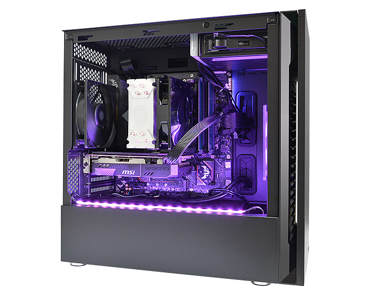 内部の複雑なシステムのノイズを最小限に抑えると同時に、システムを効率的に冷却する、SILENCIOデザインを採用。ソフトで厚みのあるフォーム材から、高密度ビニールまで、特定の周波数を正確に打ち消すために複数の遮音材を組み合わせて使用することで、静音性を高めています。また、シームレス強化ガラスを採用し、ケース内部のイルミネーションを効果的に魅せることができます。