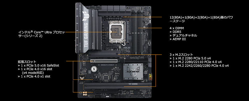 ASUS TUF GAMING B860-PLUS WIFIは、最新のインテル®Core™ Ultraプロセッサー(シリーズ2)のすべての重要な要素を取り入れ、実証済みの耐久性を兼ね備えています。改良された電源ソリューション、包括的な冷却システムを採用したマザーボードは、長時間の使用でも期待以上の安定したパフォーマンスを発揮します。高機能なAI PCアプリケーションが必要とするパワーと接続性を提供するプラットフォームです。