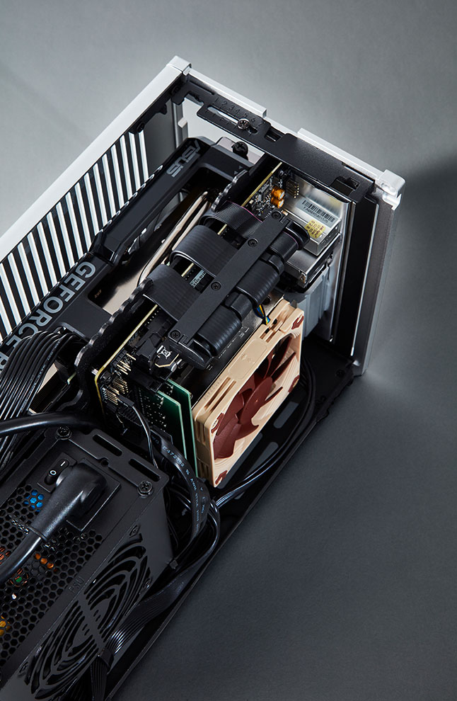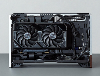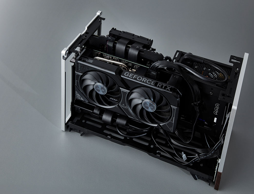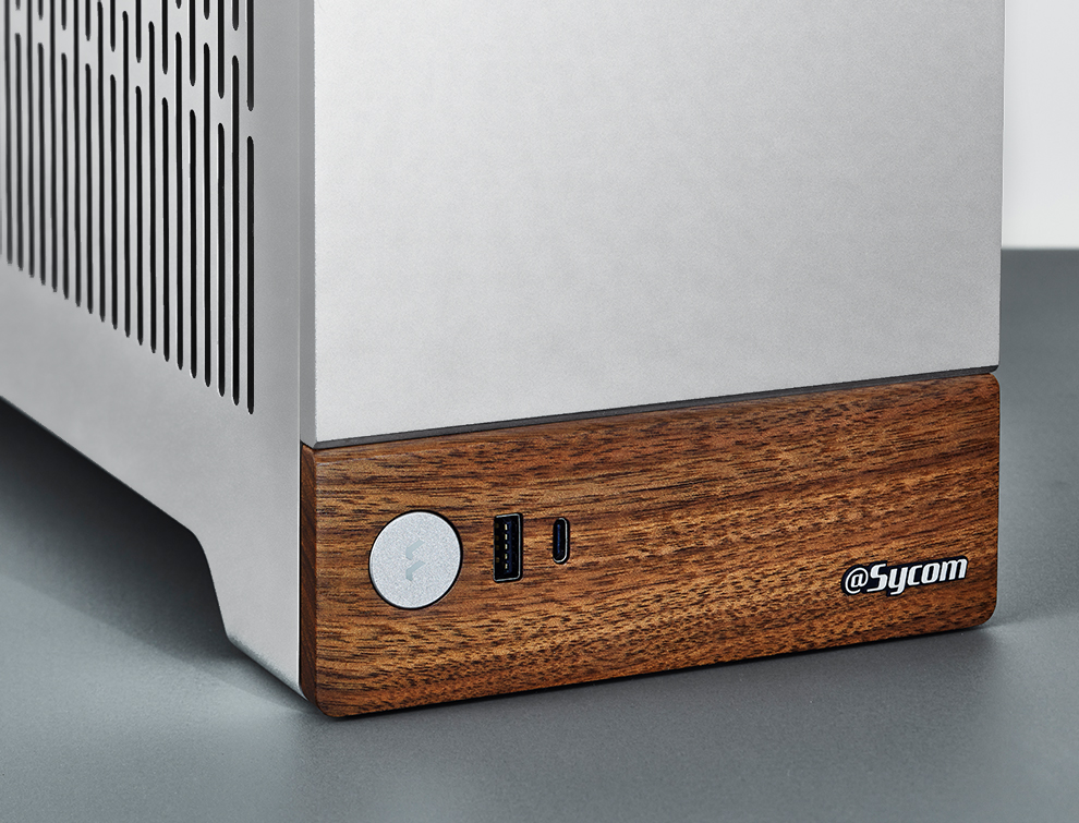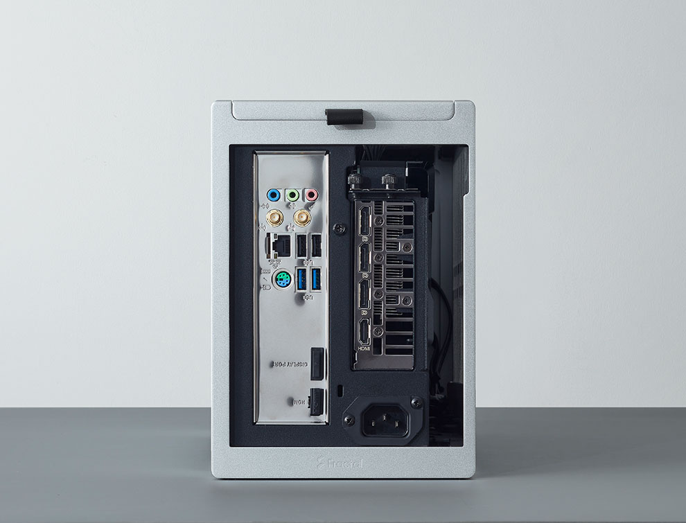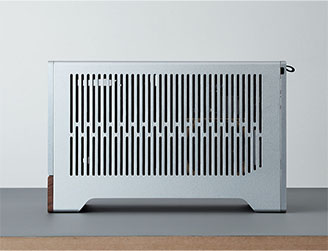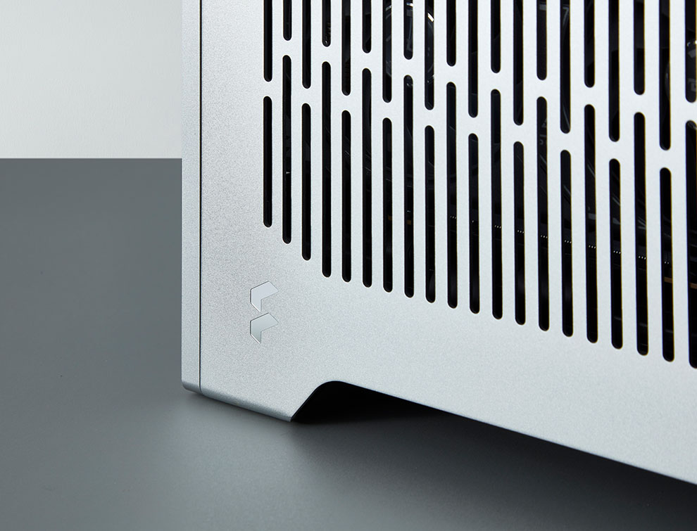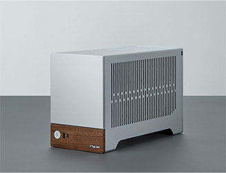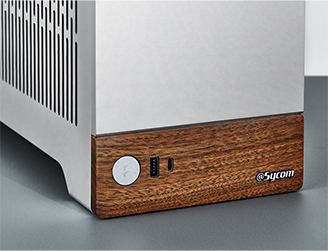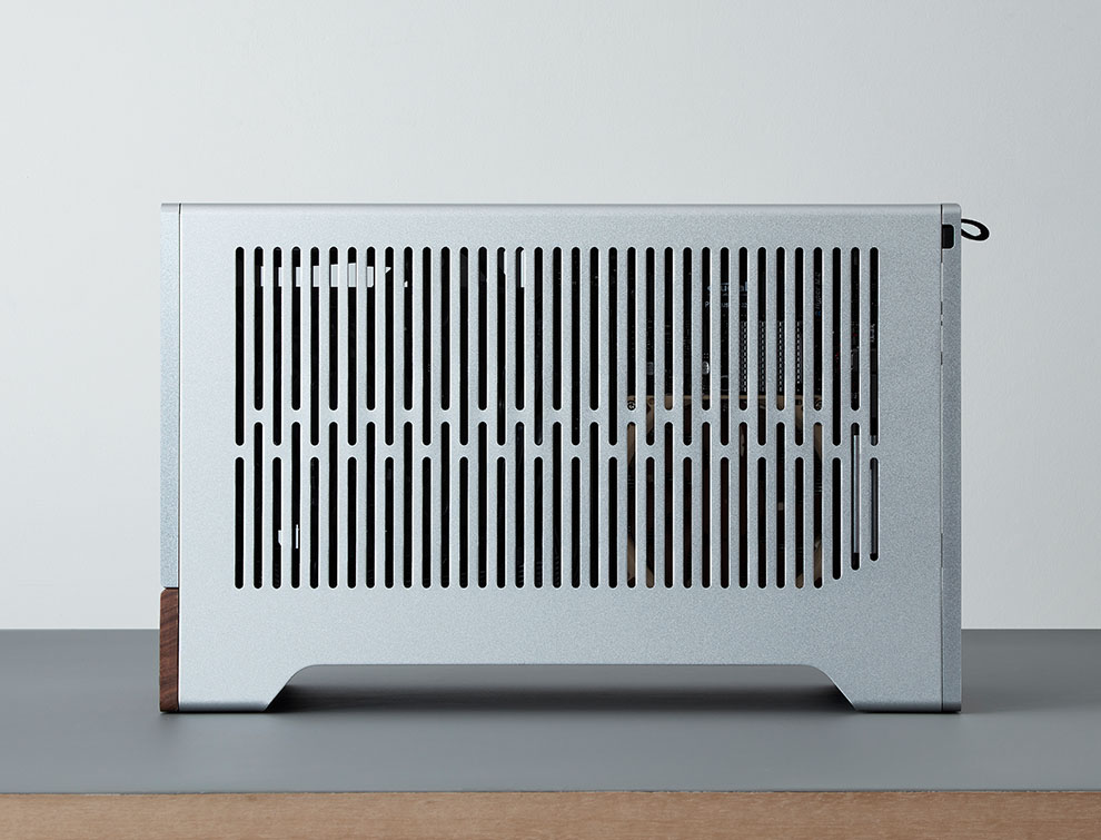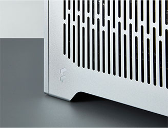 アルミニウム製の電源ボタンとUSB Type-C 20Gbps×1を含む2つのUSBポートを備えたフロントI/Oを搭載。超小型にパワフルなパーツを詰め込み、デスク環境を向上させるために作られたスモールフォームファクタケースです。アルマイト加工厚板やのウォルナット無垢材など、ブティックデザインの特徴を取り入れています。アクセスしやすい内部には、スライド式の中仕切りと高性能GPUを搭載するスペースがあります。