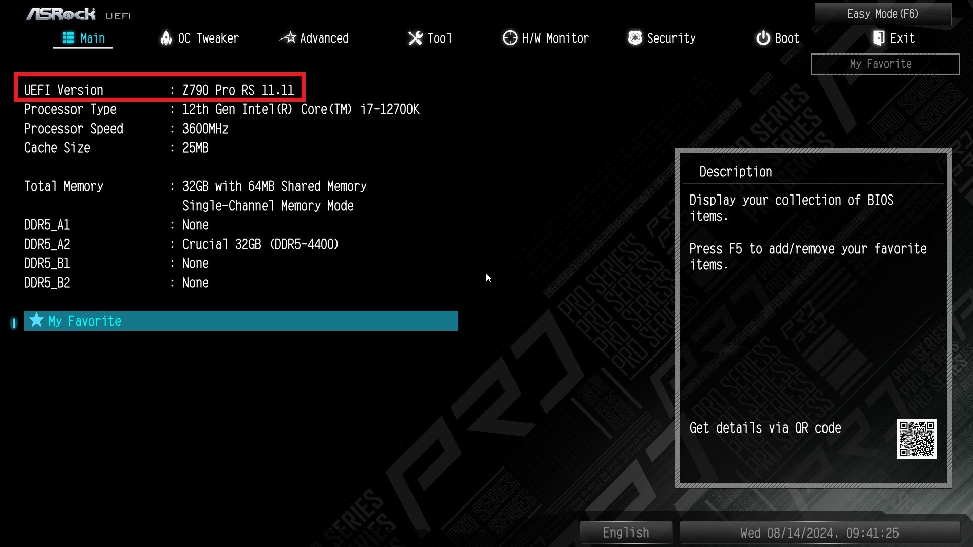 [Main]タブで赤枠のような[UEFI Version:型番、現在のバージョン]が表示されている画面が[Advanced Mode]になります。