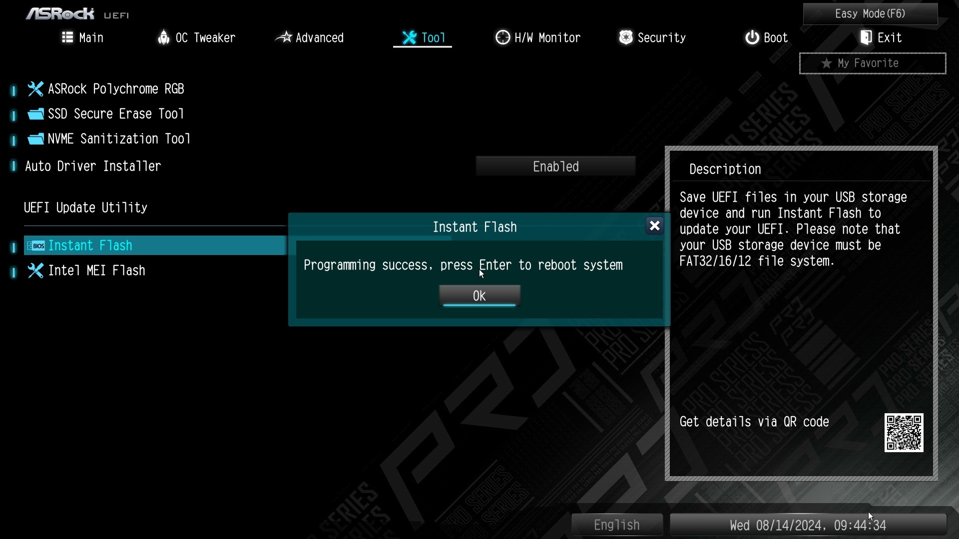 (10) BIOS更新が終わりますと[Programing success, Press OK to reboot the system]のような更新成功のメッセージが表示されます。