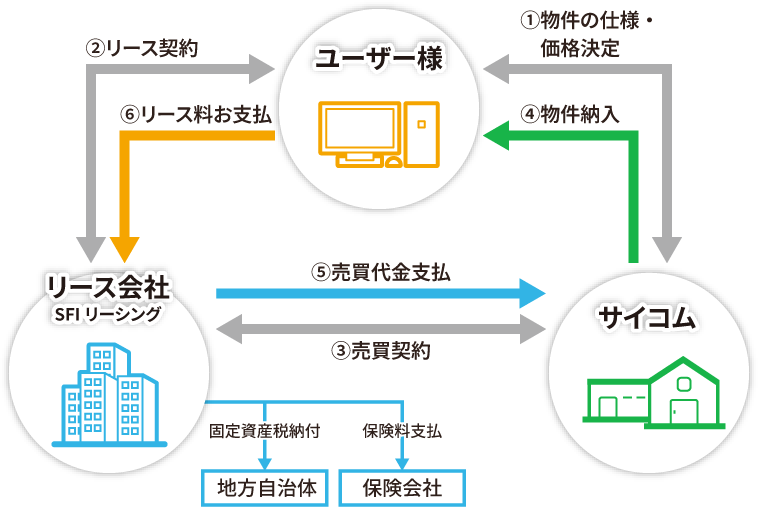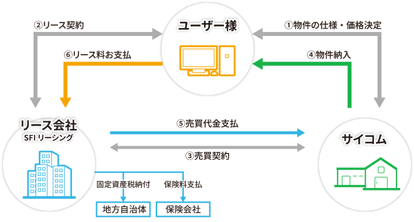 お客様が選択された物件をリース会社が販売会社(サイコム)より購入し、