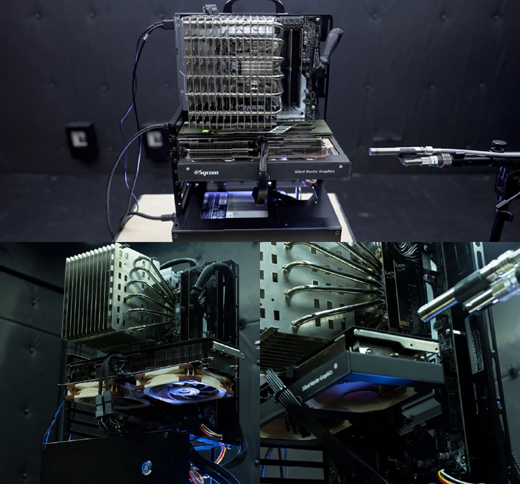 「Silent Master Graphics®」は、サイコムが独自に公的第三者機関の防音シールド室にて静音性および冷却性能の検証が行われています。検証対象のビデオカード前方から高性能マイクを5cm離した距離に固定し、ビデオカードのファン以外の駆動部品が一切ない構成で、「FINAL FANTASY XV WINDOWS EDITION ベンチマーク」(4K 高品質設定)による負荷テストを実施。ベンチマークソフトを20分実行後の動作音およびGPU温度が計測されています。