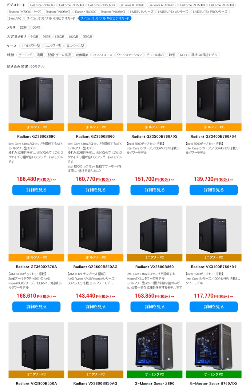 いずれのモデルも標準では「Silent Master Graphics® RTX5060Ti 16GB」が組み合わされていますが、カスタマイズによって「RTX5070 12GB」や「RTX5070Ti 16GB」に変更することも可能。予算や用途に合わせた最適なモデルを選択することができます。