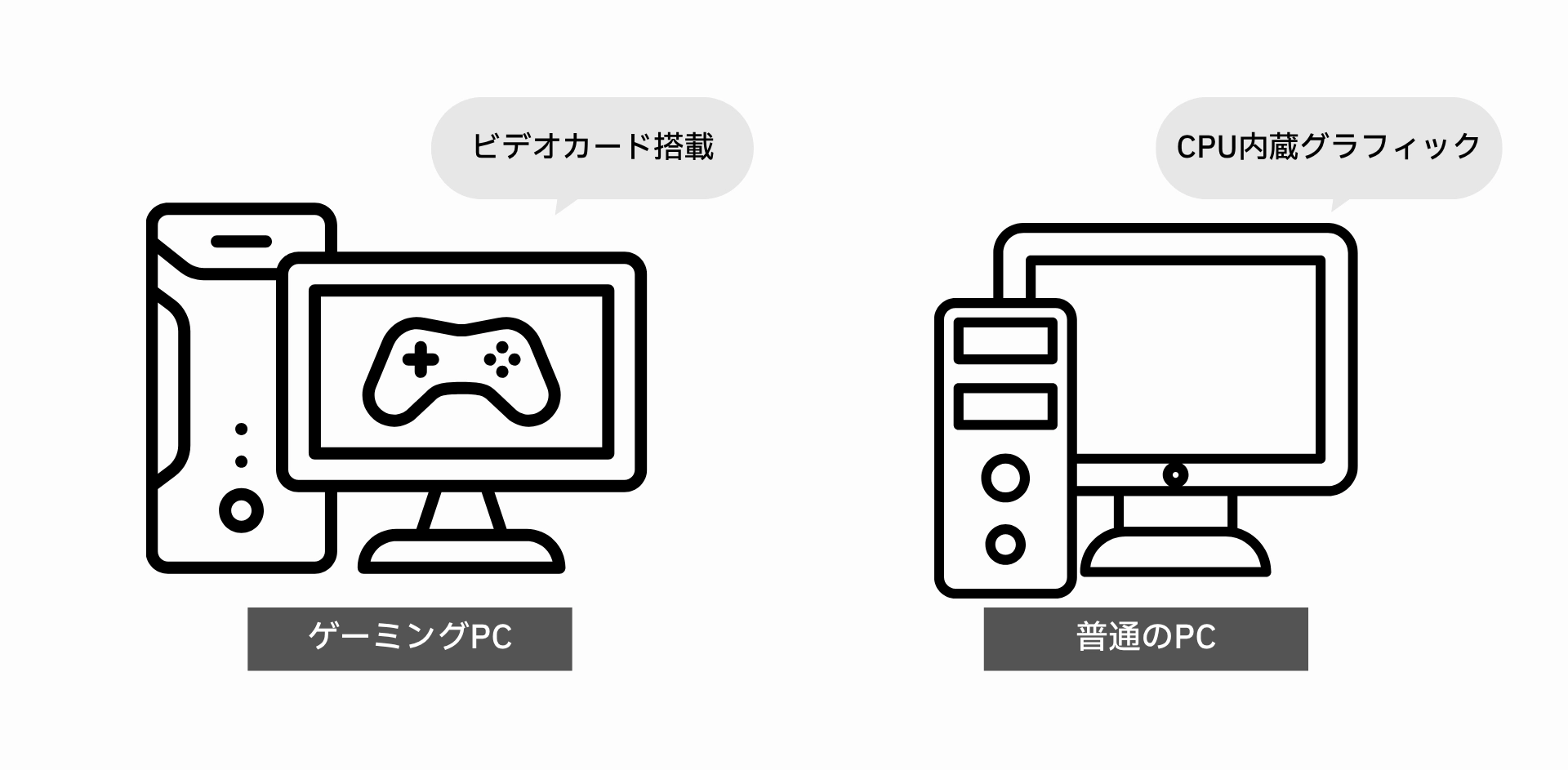 それに対して、ビジネス用途などで使用される一般的なパソコンは、CPU内蔵のグラフィック機能が利用されることが多く、動画の視聴や簡単なゲームを楽しむことはできますが、本格的な3Dグラフィックスを多用したゲームのプレイには向きません。