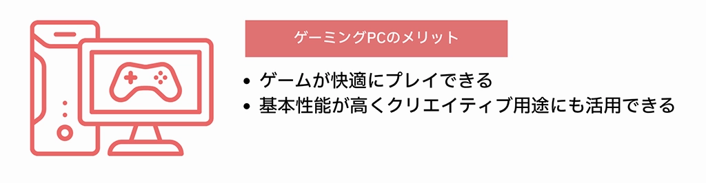 ゲーミングPCは、ゲームをプレイすることが目的のパソコンなので、3Dゲームを高解像度かつ高フレームレートでプレイできることが最大のメリットです。プレイ中のラグやカクつきを大幅に軽減し、快適にプレイすることが可能となっています。