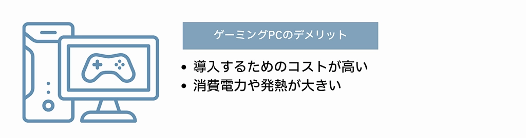 また、消費電力も非常に大きくなり、特に長時間のゲームプレイなどを行うと、電気代がかさんでしまうのも大きなデメリット。長時間の使用は、発熱なども大きくなるため、冷却性能などにも注意する必要があります。