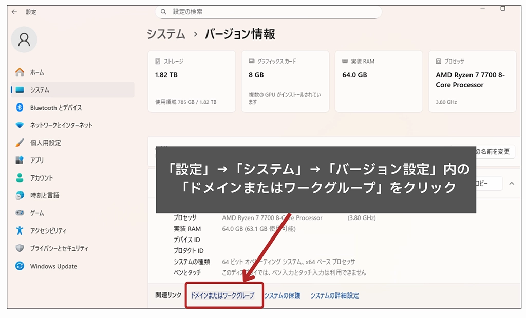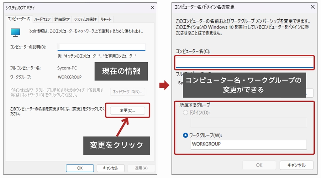 ネットワーク内でパソコンを認識するためには、まずコンピューター名とワークグールプの設定が必要となりますが、本格的なネットワークを構築するのでなければ、特に変更などは不要です。ただし、ワークグループ名(標準ではWORKGROUP)が同じになっているかどうかはチェックしておきましょう。