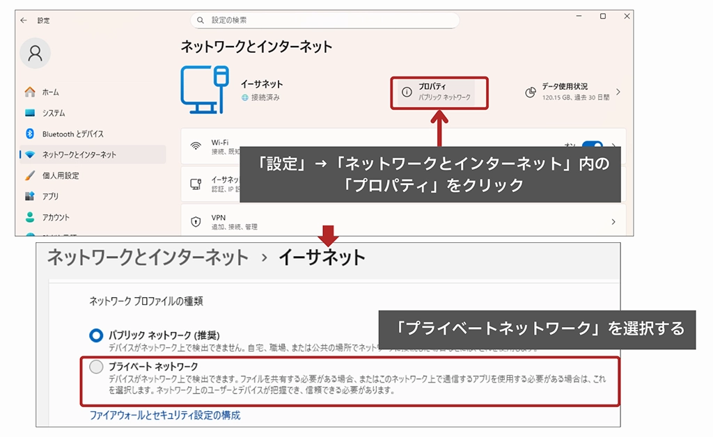 使用しているネットワークの接続方法から「プロパティ」を選び、「ネットワークプロファイル」で「プライベート(プライベート ネットワーク)」を選びます。