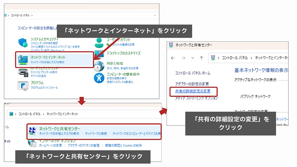 設定後は元の画面に戻り、「ネットワーク共有センター」から「共有の詳細設定の変更」を選びます。なお、このあたりの画面推移はWindows 10と11で少し異なりますが、基本的には同じ手順となります。