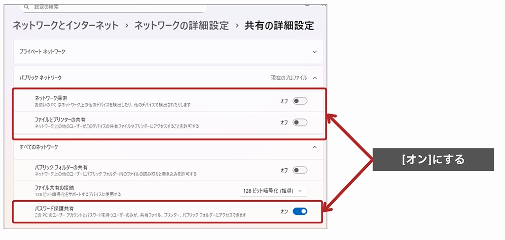 「共有の詳細設定」では、「ネットワーク探索」および「ファイルとプリンターの共有」を有効にします。また、画面下部の「すべてのネットワーク」を開き、「パスワード保護共有」でパスワードの設定を行うことができます。各設定が終わったら一度再起動を行います。