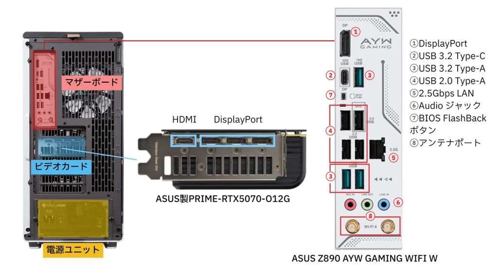 パソコンを設置したら、まずはモニターとケーブルで接続します。ゲーミングPCの場合、基本的にはビデオカードを搭載していますので、必ずビデオカードに搭載された接続端子を利用します。最近のパソコンでは、マザーボードに搭載された接続端子もありますが、これを間違えると、せっかくの高性能ビデオカードの性能が発揮されませんので注意が必要です。