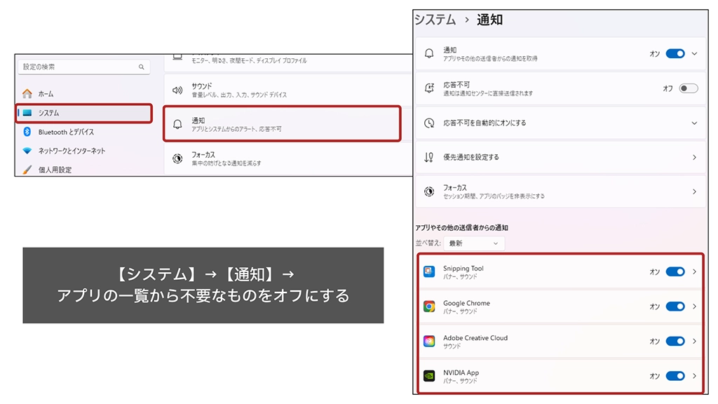 ゲーム中にポップアップや通知音が鳴ると、集中力が途切れるだけでなく、画面が見づらくなったり、マウスやキーボードの操作に影響することもあります。不要な通知を減らすために、「設定」メニューから「システム」→「通知」を選択。アプリの一覧から通知が不要なものは「オフ」にしましょう。