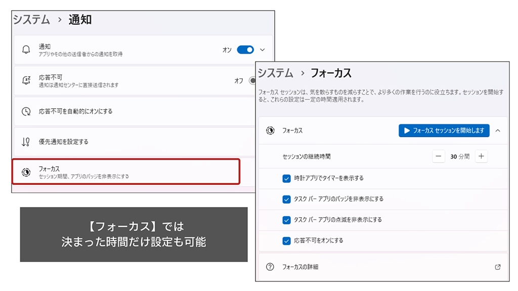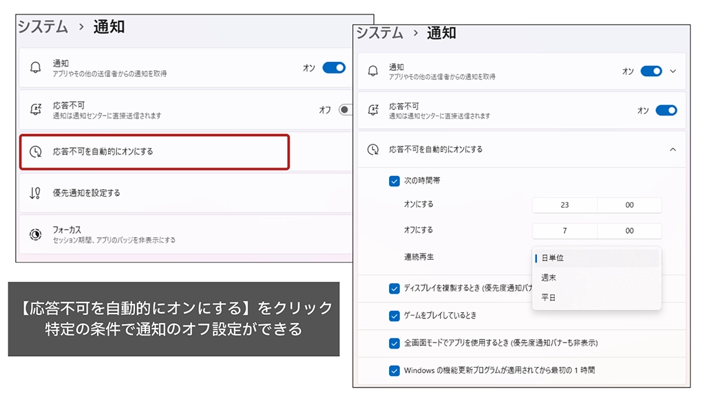 さらに、「応答不可モード(旧 集中モード)」を利用すれば、特定の時間帯やアプリ使用中は通知を完全に非表示にすることも可能。Discordやゲームランチャーなど、ゲーム中に必須のアプリは通知を残し、それ以外は非表示にしてしまいましょう。