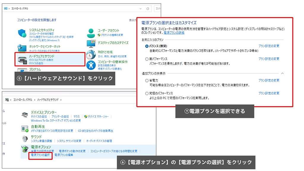なお、電源プランの設定は、先に紹介した「電源設定」と紐づいていますので、「電源設定」の設定時にあわせて確認しておきましょう。