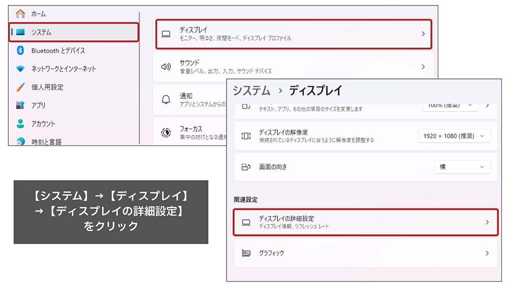 かならず、「ディスプレイ設定」→「ディスプレイの詳細設定」で、モニターがサポートしている最高のリフレッシュレートに設定しておくようにしましょう。