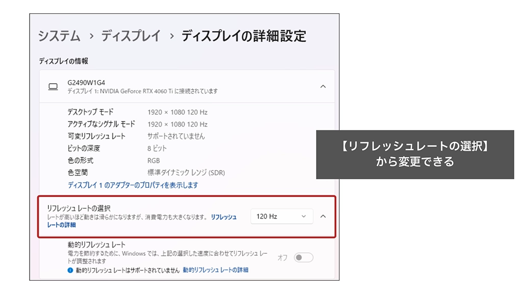 ゲーミングモニターは、144Hzや240Hzといった高リフレッシュレートに対応しているのが特徴。しかし、Windowsの設定が初期値のままだと60Hzで動作していることがあります。
