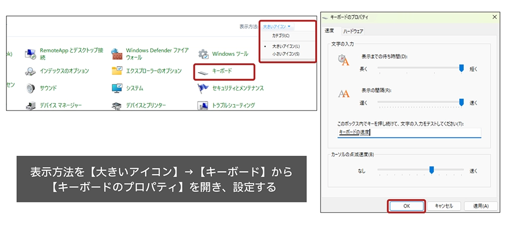 キーボードに関する設定項目は少なく、「キーボード」のプロパティにある「表示までの待ち時間」および「表示の間隔」は、キーを長押しした場合の連続入力に関する設定です。キー長押しによる連打などが必要な場合は、「表示までの待ち時間」は「短く」、「表示の間隔」は「速く」に設定します。下にあるボックスに文字を入力すると、設定した速度を確かめることができます。