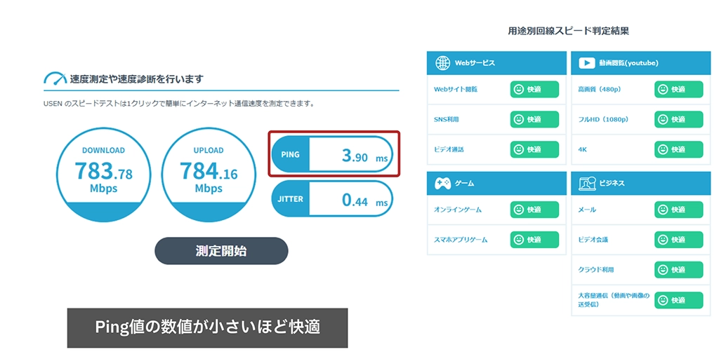 回線速度が速いのはもちろんのこと、オンライン対戦の場合、応答速度を示すPing値が非常に重要です。Ping値が低いほど、ラグを抑えて快適にプレイすることができます。Ping値は、通信回線速度の計測サイトなどで確認できます。なお、ゲームを快適にプレイするためには、30ms以下が必須。15ms以下が望ましいと言われています。