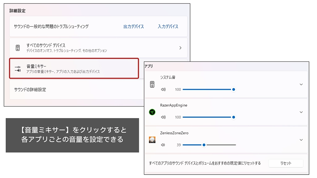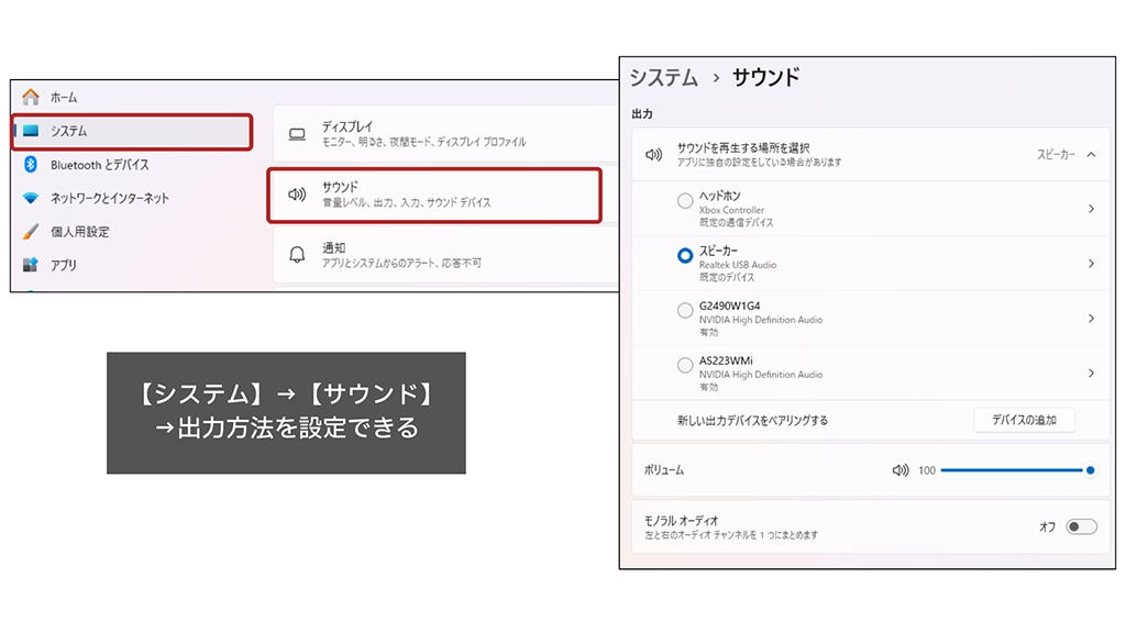 サウンド設定では、実際に使用するスピーカーやマイク、ヘッドセットなどを選択し、入出力の音量などを調整します。ヘッドホンやスピーカーから音が聞こえないという方は、ちゃんと使用するデバイスが選択されているかどうかをチェックしましょう。