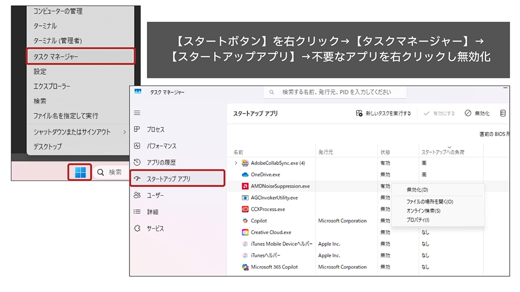 スタートアップの削除は、「タスクマネージャー」の「スタートアップ」タブで行います。「有効」になっているソフトの中から、ゲームや日常作業に不要なものは右クリックから「無効化」を選択しましょう。ただし、スタートアップを無効にすることで不具合が起こるソフトもありますので、内容がわからないソフトなどを無闇に無効化するのは避けたほうが賢明です。