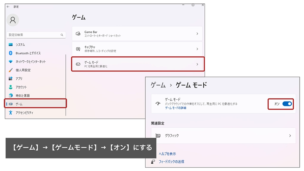 「ゲームモード」は、「設定」から「ゲーム」→「ゲームモード」を選んで有効にします。特にCPU使用率の高いゲームで効果を実感しやすい機能と言われています。