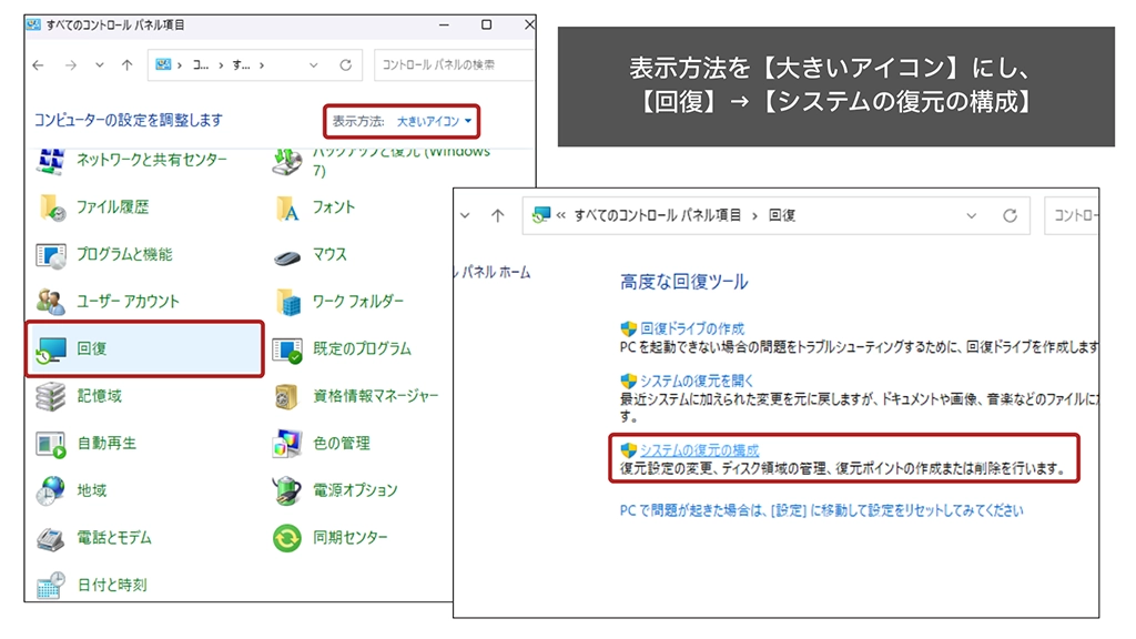 一方、トラブル発生時には、同じ画面から「システムの復元」を選択。あとは指示にしたがっていけば復元することができます。