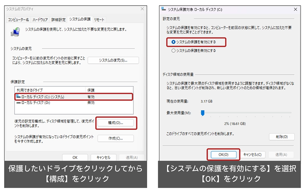復元ポイントを手動で作成するためには、コントロールパネルで「回復」を選び、「システムの復元を構成」を選択し、「作成」を選びます。なお、復元ポイントが作成されるのは、保護が「有効」になっているドライブのみ。必要に応じて有効化しておきましょう。