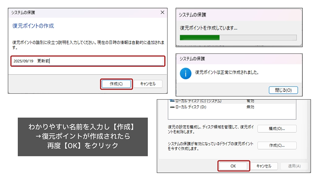 Windowsの復元ポイントは、システム構成やドライバー、レジストリ設定などを保存し、問題発生時に以前の状態へ戻すことができる機能。復元ポイントはプログラムやドライバーのインストールなどシステムの更新時に自動的に作成されますが、大型アップデートやドライバーの更新前には念の為、手動で作成しておくとよいでしょう。