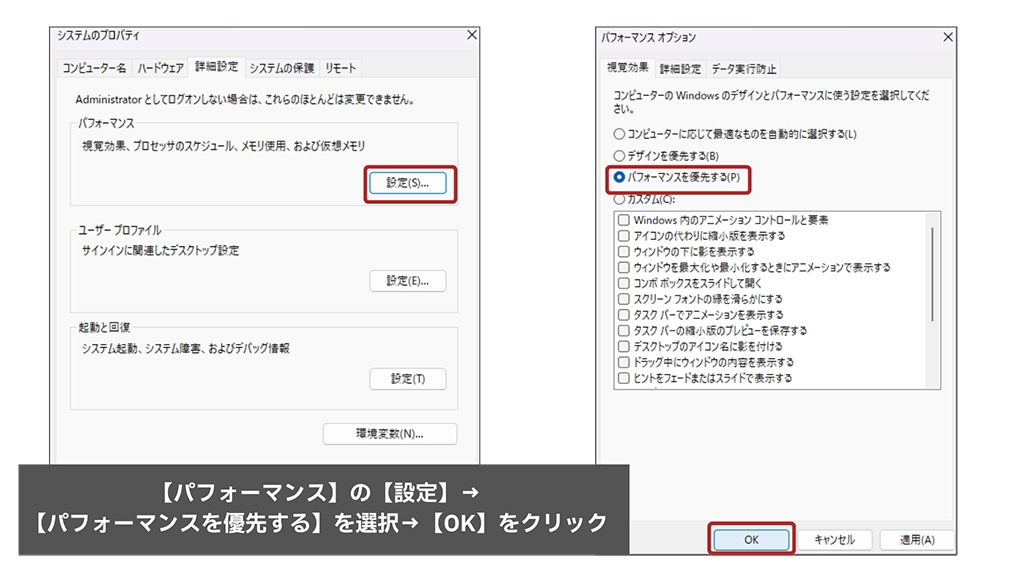 設定方法は、「スタート」ボタンを右クリックして「システム」を選択し、右側の関連設定から「システムの詳細設定」を選択。「パフォーマンス」→「視覚効果」で「パフォーマンスを優先する」を選択します。