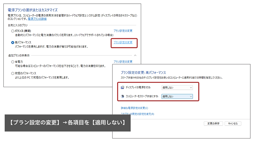 長時間のオンラインプレイ中、少し離席している間に自動でスリープ状態になってしまうと、接続が切れてしまう可能性があります。そういったトラブルを防ぐために、「プラン設定の編集」画面で、「ディスプレイの電源を切る」(自動消灯)、「コンピューターをスリープ状態にする」(自動スリープ)をそれぞれ「適用しない」に設定しておきましょう。