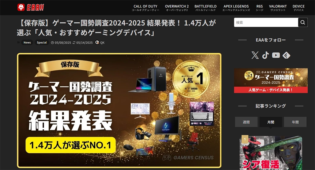 「ゲーマー国勢調査」は、株式会社JILCHが運営するゲームニュースサイト「EAA!!(イーエーエー)」が2016年から継続調査している、ゲームのプレイタイトルやデバイス事情など、ゲームコミュニティのリアルな動向やトレンドを反映した大規模なゲーマー意識調査。開始当初は2,000名だった参加者が近年では1万人を超えており、ゲーマーにしかわからないコアな声が集められています。