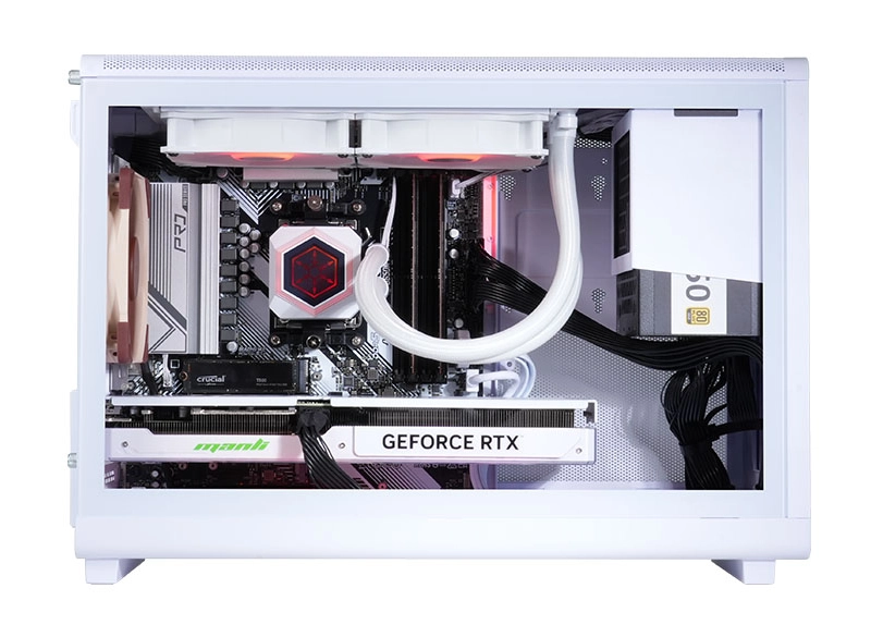一般的なミドルタワー型と比較すると圧倒的に小さな容量26.3リットルのコンパクトな筐体でありながら、スタイリッシュかつ通気性の高いメッシュ仕様のPCケースと冷却性能と静音性の高さで人気のNoctua製CPUクーラーを組み合わせることによって、高い冷却性能と静音性を実現しています。「NVIDIA GeForce RTX 5060 Ti」のビデオカードを標準搭載することで、フルHD環境での快適なゲーミング性能を確保。さらにゲーミング性能を高めたい場合は、カスタマイズによって「GeForce RTX 5080」までグレードアップすることも可能となっています。また、長時間稼働を前提とする方は、CPUクーラーを水冷ユニットにカスタマイズすることで、安定した冷却性能を確保することも可能。PCケースは白・黒・ウッドの3色から選択することができます。