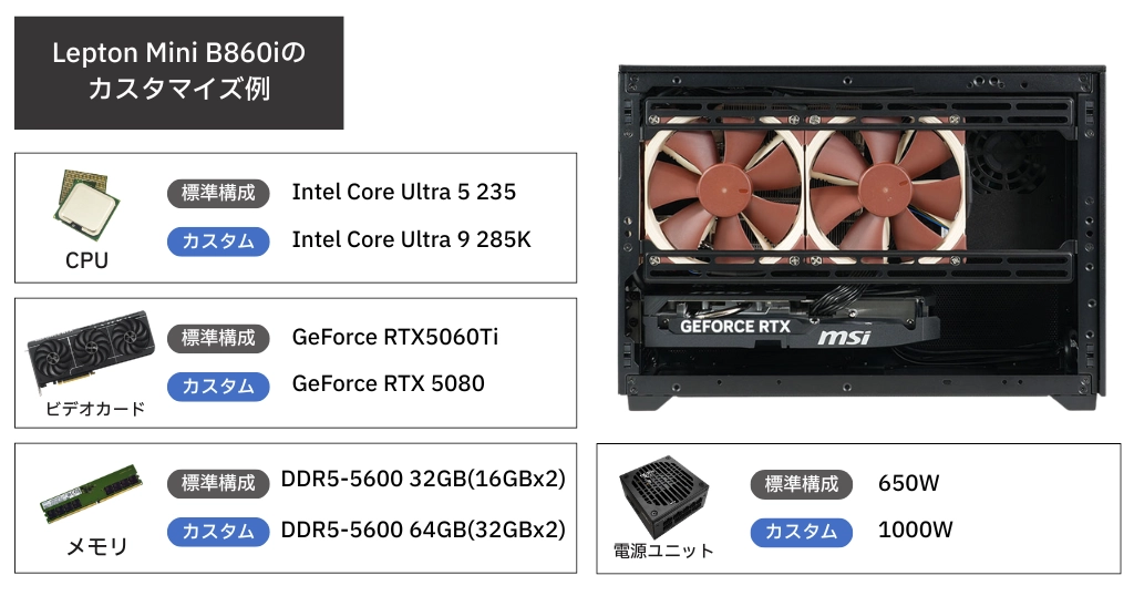 一方、Intelプラットフォームの「Premium Line Mini B860FD/T」とAMDプラットフォームの「Premium Line Mini B850FD/T/A」は、キューブ型のコンパクトモデルで、机の上においてもインテリアのひとつとして自然に溶け込むデザインが人気のラインナップとなっています。こちらのモデルも標準構成で「NVIDIA GeForce RTX 5060 Ti」のビデオカードを採用。カスタマイズによって「GeForce RTX 5080」を搭載することも可能となっています。