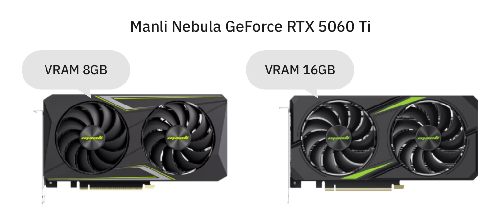 また、先述した通り、ビデオカードを選ぶ場合は、GPUの性能だけでなく、VRAM容量も重要。基本的に、高性能のGPUを搭載しているビデオカードほどVRAM容量も大きくなる傾向にありますが、例えば「NVIDIA GeForce RTX 5060 Ti」のように、同じGPUでVRAM容量の異なるビデオカードが存在する場合は、VRAM容量の大きいモデルを選ぶことをおすすめします。
