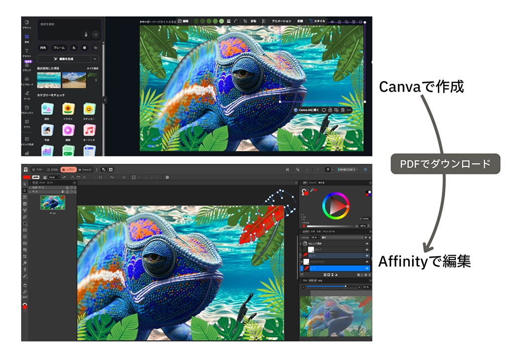 「Affinity」は、「Canva」と連携することによって、「手軽さ」と「本格編集」を両立できるのが大きな強みになっています。「Canva」でテンプレートを使ってデザインの土台を作り、「Affinity」で細かい調整や高度な編集を行うというのが非常に効率的な流れとなります。