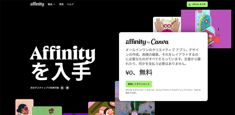 「Affinity」の公式サイト( https://www.affinity.studio/ja_jp )にアクセスし、する。画面中央下部の「登録してダウンロード」、あるいは画面右上の「Affinityを入手」→「登録してダウンロード」をクリック。「Canva」アカウントに未ログインの場合はログイン、未作成の場合は新規にアカウントを作成し、画面の指示に従って進めます。