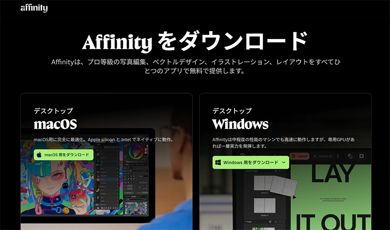 「Affinity」は、Mac/Windows版ともに「永久無料」で提供されており、Canvaアカウントに登録(無料)することで利用することができます。