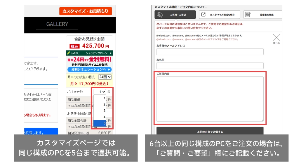 公式サイトの「カスタマイズ・お見積もり」画面からは、同じ構成のパソコンを、一度に5台までご注文していただくことが可能です。もし6台以上の注文が必要な場合は、カスタマイズを進めた次のページの「ご質問・ご要望」に記載いただくことによってご注文いただくことが可能です。