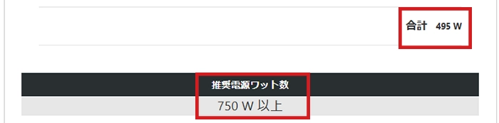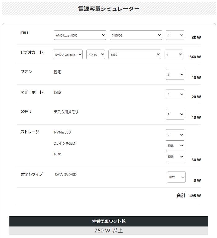 電源シミュレーターの推奨電源容量は、そのあたりも考慮した数値となっていますが、今後、CPUやビデオカードの換装、メモリやストレージの増設を検討している方は、そのあたりの数値も見込んで、必要な電源容量を算出するようにしましょう。