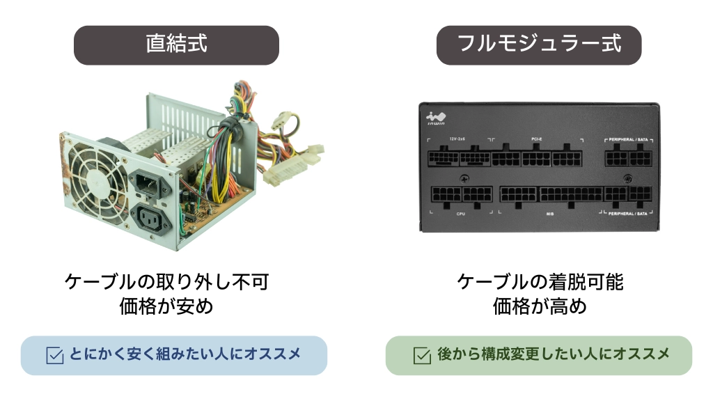必要なケーブルのみとなるため、取り回しも非常に楽なのが大きなメリットとなりますが、プラグイン式は通常の電源ユニットよりも少々値段が高くなる傾向にあります。