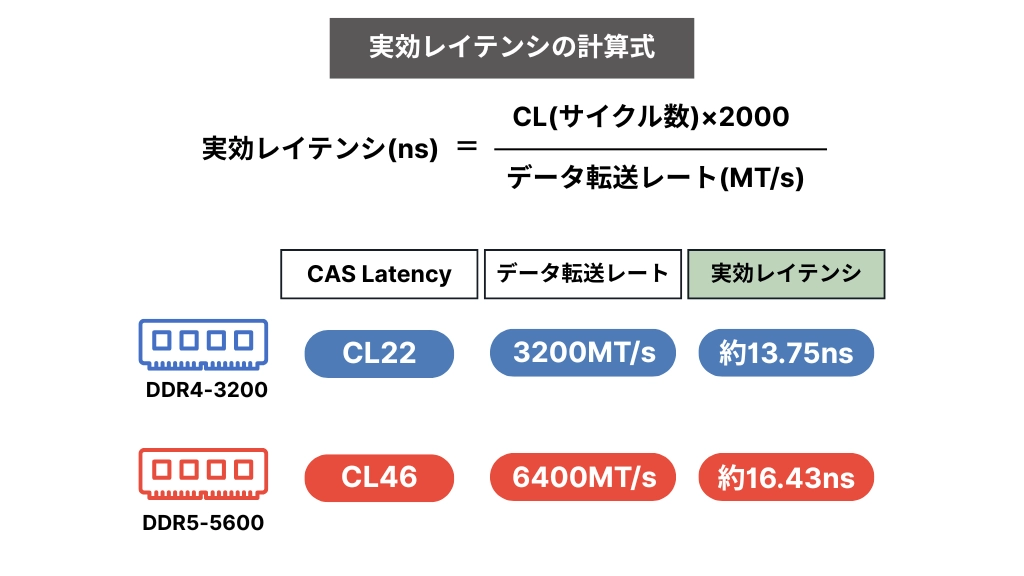 このように、単純なレイテンシではDDR5よりもDDR4のほうが優位に見えますが、ここで重要なのは「実効レイテンシ」です。この「実効レイテンシ」は、メモリのクロック周波数とレイテンシの値から、実際の遅延時間を導き出した指標。DDR5のレイテンシの値は確かに大きいですが、クロック周波数の速さに吸収されるため、実効レイテンシではレイテンシの値ほどの差は見られない傾向にあります。