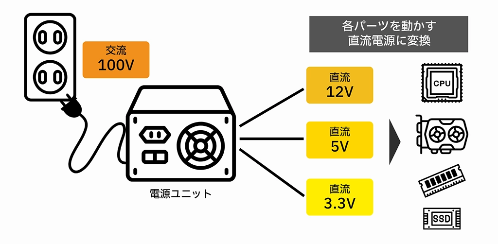 電力供給のために電源ユニットが使用されるのは、パソコンを構成するパーツが、家庭用コンセントから取り出せる交流電源(AC)をそのまま利用することができないからです。電源ユニットは、交流電源を各パーツが利用できる直流電源(DC)に変換する、つまり、100Vの交流電源を、PCパーツを動かすために必要な+12Vや+5V、+3.3Vなどの直流電源に変換するという非常に重要な役割を担っています。